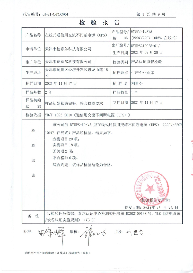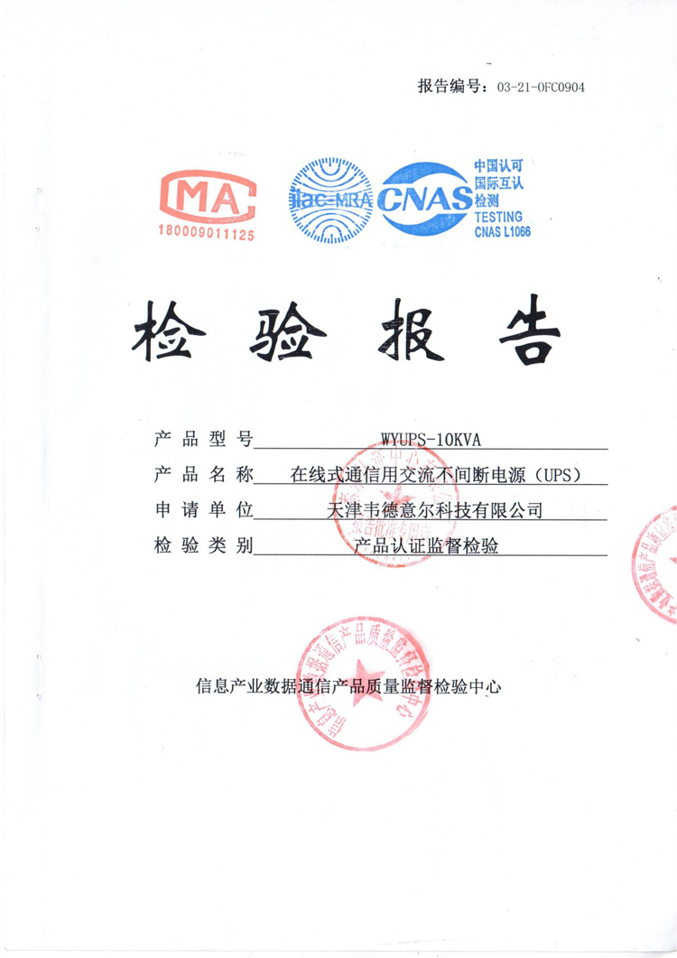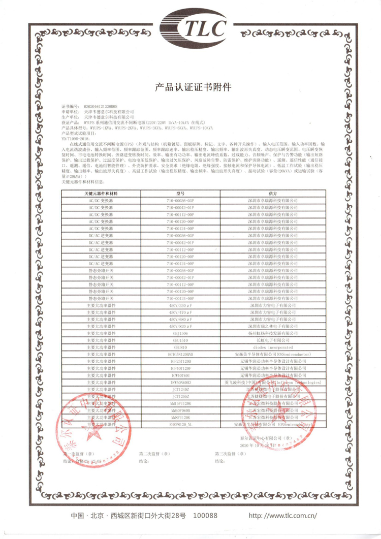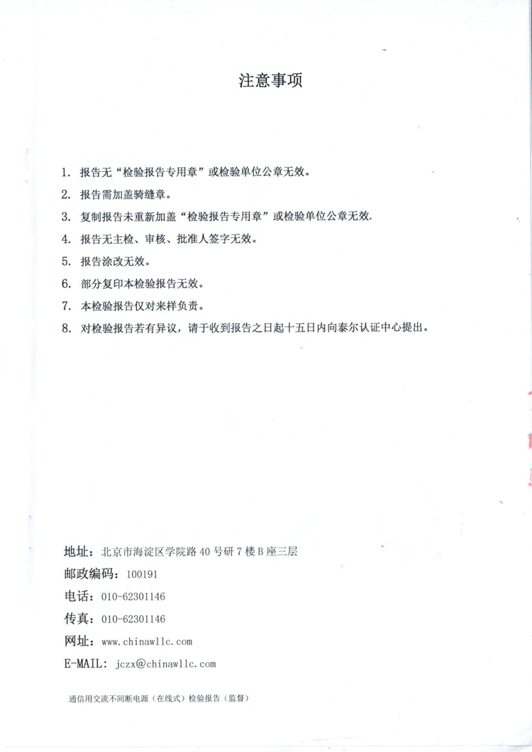 在線式通信用交流不間斷電源(UPS)10kVA泰爾認(rèn)證證書及檢驗報告