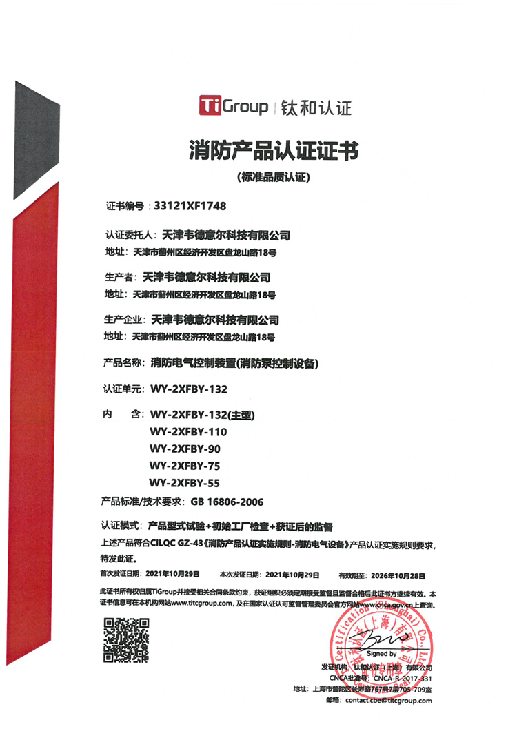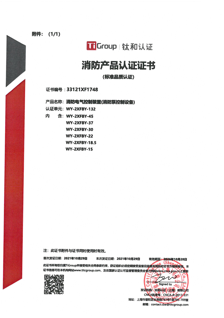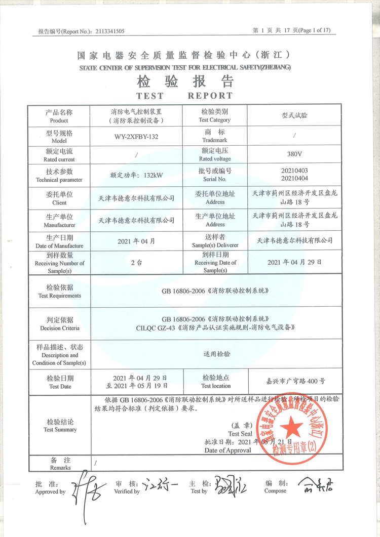 消防電氣控制裝置(消防泵控制設(shè)備WY-2XFBZ-132)認(rèn)證證書及檢驗(yàn)報(bào)告