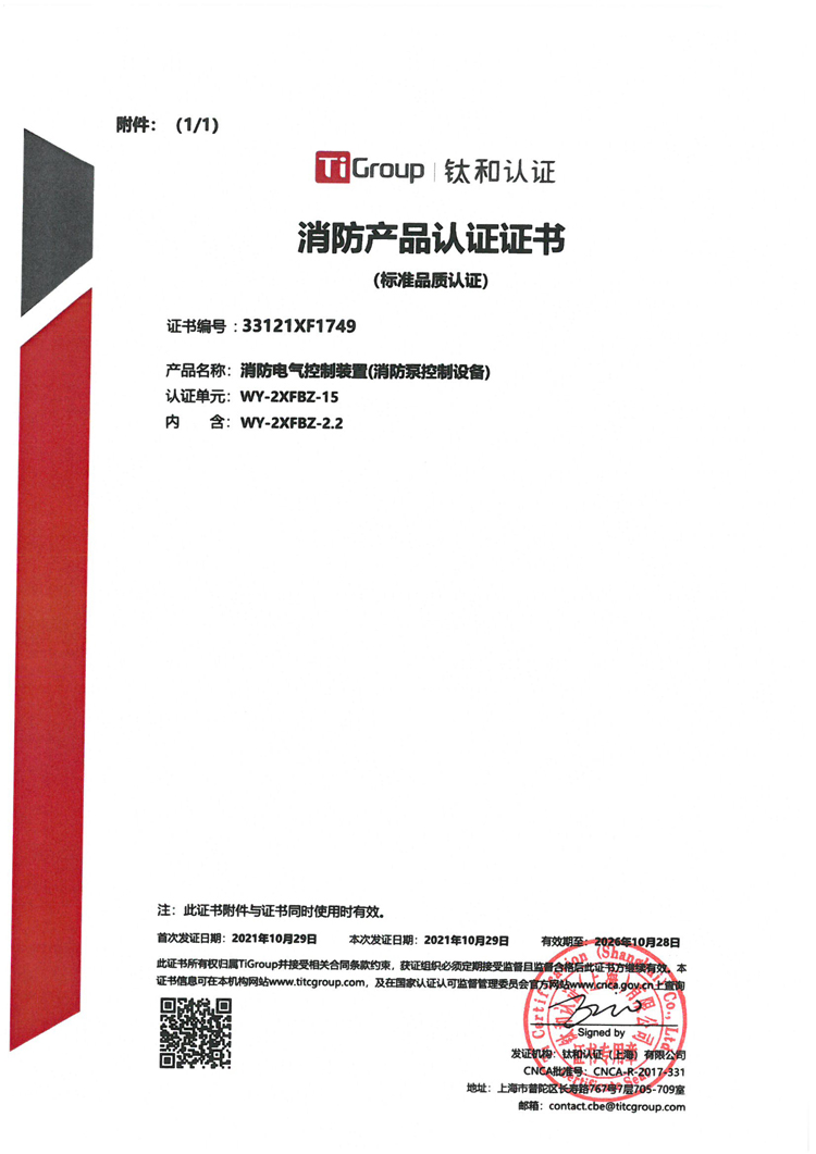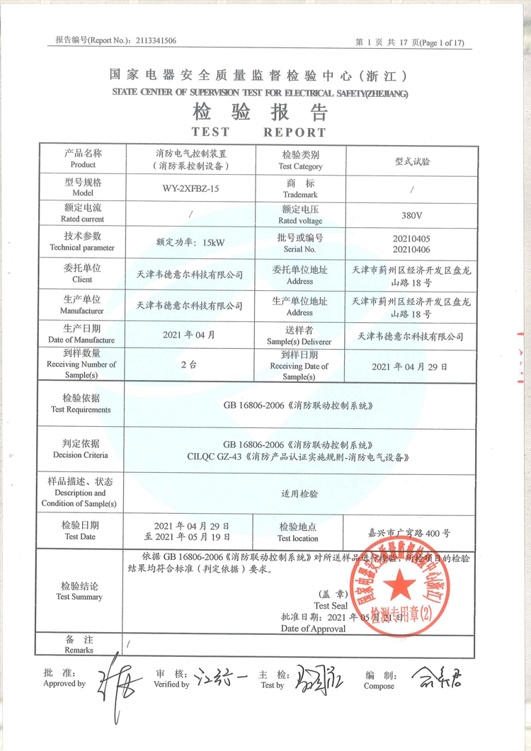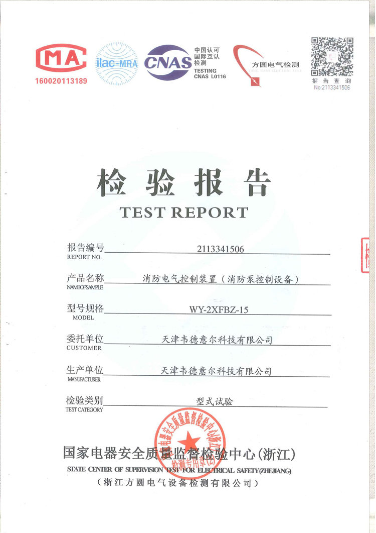 消防電氣控制裝置(消防泵控制設備WY-2XFBZ-15)認證證書及檢驗報告