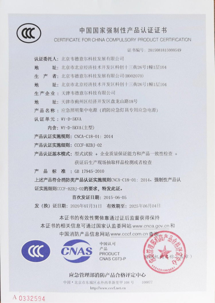 應(yīng)急照明集中電源WY-D-5KVA產(chǎn)品認(rèn)證證書